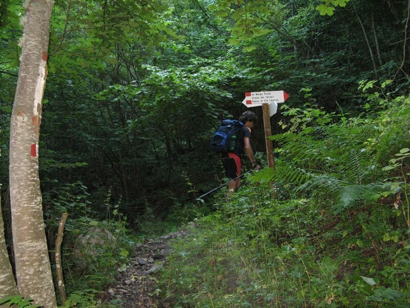 Oltre il ponte imboccare la strada di destra che sale subito lungo il versante della montagna compiendo un tornante a sinistra e poi un lungo traverso nel bosco.