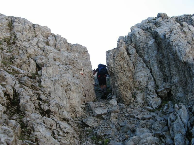 Un breve tratto, in canalino, con fune d'acciaio è obbligatorio e, una volta superato il tratto ripido, dove la valle piega più decisa a destra, il sentiero abbandona il fondo della valle e risale le placconate calcaree di sinistra in direzione del Sasso Rosso.